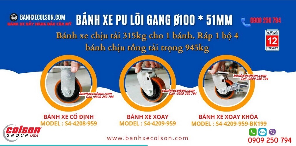 - Bánh xe PU lõi Gang phi 100x51mm chịu lực 315kg :