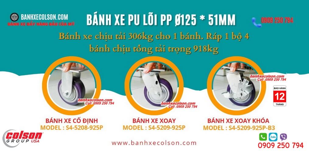 - Bánh xe PU lõi nhựa PP phi 125x51mm chịu lực 306kg :