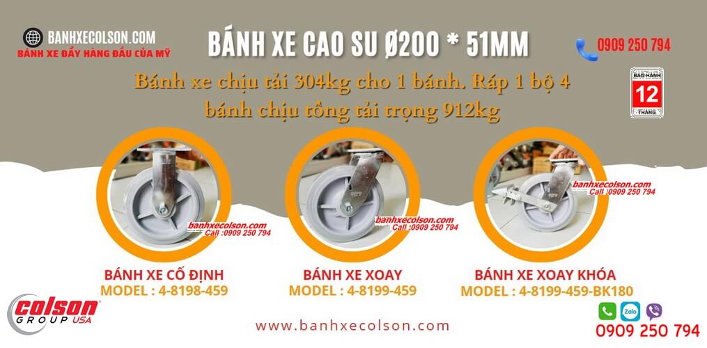 Đối với dòng bánh xe đẩy chịu lực 300kg cho 1 bánh, hãng Colson có các đường kính kích thước bánh xe phi 100mm ( 4 inch ), 125mm ( 5 inch ), 150mm ( 6 inch ), 200mm ( 8 inch ) bề rộng bánh xe 51mm ( 2 inch ). Xin quý khách hàng lưu ý hàng Colson thương hiệu Mỹ cho nên sản xuất theo tiêu chuẩn Mỹ sử dụng hệ inch vì thế khi tính ra hệ mét sẽ có dung sai. Dưới đây là các loại bánh xe đẩy hàng chịu lực 300kg cho quý khách tham khảo.