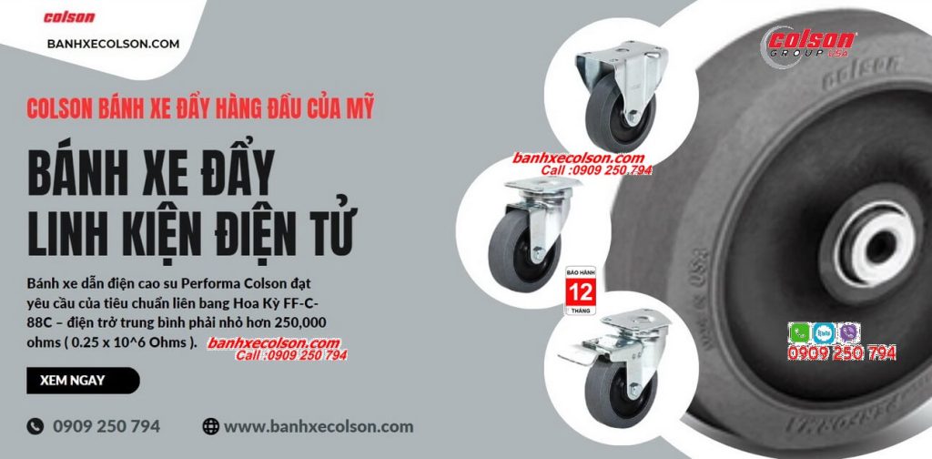 Bánh xe cao su Performa Conductive (dẫn điện) đạt yêu cầu của tiêu chuẩn liên bang Hoa Kỳ FF-C-88C – điện trở trung bình phải nhỏ hơn 250,000 ohms. Bánh xe đẩy linh kiện điện tử Colson có thông số kỹ thuật như sau :