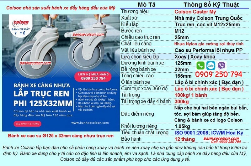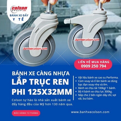 Bộ 4 bánh xe chịu tải 300kg có đường kính 125mm bề rộng 32mm lắp trục ren M12x25mm. Vật liệu bánh xe được làm bằng cao su tổng hợp Performa, càng bánh xe được làm bằng nhựa Nylon gia cường sợi thủy tinh kết hợp với bánh xe cao su cho sản phẩm bánh xe lăn nhẹ và êm, bánh xe đẩy phi 125mm dùng cho y tế của Colson Mỹ được ưa chuông do độ bền cao, bánh xe chắc chắn sản xuất với tiêu chuẩn ICWM Hoa Kỳ. Thiết kế bánh xe có 2 dạng chính dành cho xe đẩy có tổng tải trọng 300kg, Bánh xe dạng trục ren được nhà sản xuất thiết kế bánh xe có thể xoay 360 quay quanh trục điều này làm cho bánh xe dễ dàng di chuyển khi xoay ở khu vực nhỏ, và loại có khóa tiện dụng.