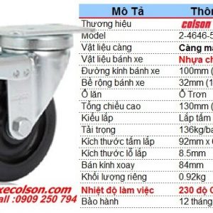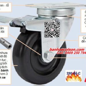 Hãng bánh xe công nghiệp Colson nhà sản xuất bánh xe đẩy hàng đầu của Mỹ hơn 130 năm qua cung cấp dòng bánh xe chịu nhiệt nhựa Thermo sử dụng trong môi trường nhiệt độ cao làm việc gián đoạn đến +250 độ C, hay liên tục ở +230 độ C. Bánh xe có khóa chịu nhiệt được sản xuất từ hỗn hợp nhựa kỹ thuật đặc biệt nên có đặc tính bảo vệ mặt sàn, không tạo vết đen trên sàn, gần như không hấp thụ nước, kích thước bánh xe phi 100 x 32 ( 4inch ) chịu tải trọng 136kg càng thép mạ kẽm có tổng chiều cao 130mm rất bền.