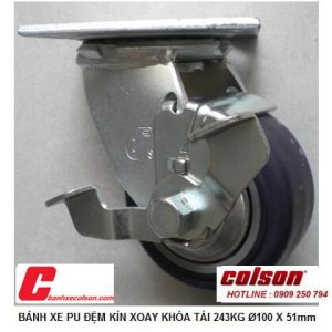 Bánh xe pu lõi pp có nắp che bụi hai bên ngăn bụi bám và vòng bi dùng cho các xe đẩy vải sợi, càng bánh xe có khóa bên càng mạ kẽm lắp mặt đế xoay chuyển hướng di động ( lắp tấm, tấm lắp gắn vít ) thương hiệu SP Caster nhà sản xuất bánh xe đẩy giá rẻ của Colson Group, bánh xe chịu tải 243kg/ bánh( tải trọng này tính cho 1 bánh xe ) kích thước bánh xe phi 100×51 có tổng chiều cao 143mm tính từ mặt đáy lên ngay tấm lắp. Bánh xe đẩy sp caster được thiết kế cho khách hàng trong nước sản xuất bằng công nghệ tiên tiến đáp ứng đầy đủ các hệ thống tiêu chuẩn chất lượng của ICWM ( hiệp hội các hãng sản xuất bánh xe đẩy của Hoa Kỳ ).
