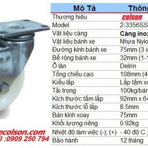 Thông số kỹ thuật bánh xe xoay khóa d75 nhựa nylon càng inox 2-3356SS-254-BRK4