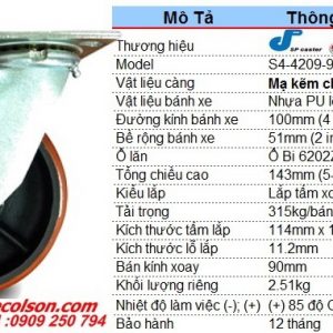 Bánh xe dẫn hướng 100 x 51 pu lõi gang chịu tải 315kg S4-4209-959