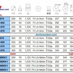 Thông số kích thước bánh xe đẩy chịu lực 1,035 – 1,575kg PU-AL càng thép dày 9.5mm