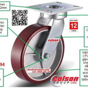 Bánh xe công nghiệp Colson có vỏ ngoài Polyurethane ( PU ) được ép phun gắn chặt với lõi nhôm. Thiết kế đặc biệt này của Colson để tăng độ bền của bánh xe, chịu va đập và chấn động. Bánh xe PU ( Polyurethane ) được dùng phổ biến, phù hợp cho mọi ứng dụng. Các ưu điểm khác là chịu được hầu hết các loại dầu mỡ, hóa chất, nước, dung môi và acid và không tạo vết trên sàn.