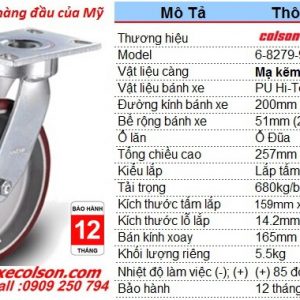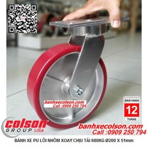 Bánh xe đẩy chịu lực xoay 360 độ Colson Mỹ lăn không tạo vết trên sàn, lăn nhẹ, êm và chịu va đập. Kích thước bánh xe đẩy 200x51mm chịu tải trọng 680kg có tổng chiều cao 257mm kiểu lắp bánh xe càng di động phù hợp cho di chuyển xoay chuyển hướng.