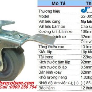 Bánh xe nhựa cao su tổng hợp TPE thương hiệu SP Caster ( Colson Group ) càng bánh xe mạ kẽm có kích thước bánh xe 10cm ( 4inch ) bề rộng bánh xe 32mm. Bánh xe xoay khóa chịu lực 82kg trên 1 bánh lăn êm nhẹ trong di chuyển, dễ dàng xoay chuyển, đổi hướng.