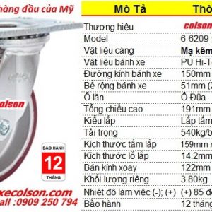 Bánh xe PU lõi Nhôm Colson có các đặc tính: không tạo vết trên sàn, lăn nhẹ, êm và chịu va đập. Bánh xe pu 150 có tổng chiều cao 191mm càng bánh xe xoay mạ kẽm chất lượng cao giúp tăng tuổi thọ hạn chế rỉ sét.