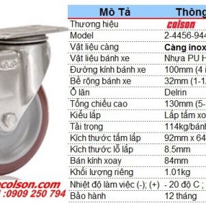 Thông số kỹ thuật bánh xe pu có khóa càng inox d100 2-4456-944-BRK4
