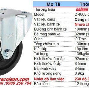 Colson là thương hiệu bánh xe đẩy hàng đầu của Mỹ cung cấp hơn 200.000 kiểu dáng bánh xe đẩy khác nhau, từ những bánh xe đẩy loại nhỏ dùng cho nội thất đến các loại lớn sử dụng cho ngành công nghiệp như bánh xe siêu tải, bánh xe càng inox 304, bánh xe đẩy chịu nhiệt , bánh xe đẩy chống tĩnh điện, bánh xe đẩy bệnh viện, bánh xe giảm xóc, bánh xe đẩy công nghiệp chịu tải trọng lên đến hơn 2.025 kgs.