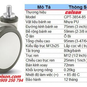 Bánh xe thiết kế trục xoay lắp ổ bi đôi được đúc ép chính xác, bền và tuổi thọ cao. Bánh xe cọc vít M12x25mm xoay không khóa. Kích thước bánh xe đẩy 75mm x 59mm tổng chiều cao phủ bì 95mm, bánh xe đẩy chịu lực 80kg cho 1 bánh.