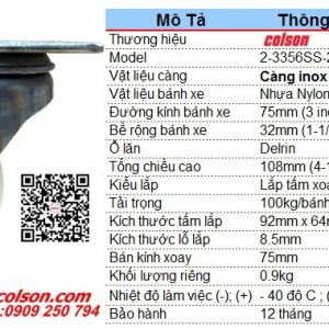Thông số kỹ thuật bánh xe xoay d75 nhựa nylon càng inox 2-3356SS-254