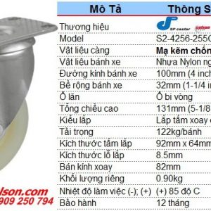 Thông số kích thước bánh xe xoay phi 100 nhựa trắng Nylon S2-4256-255C