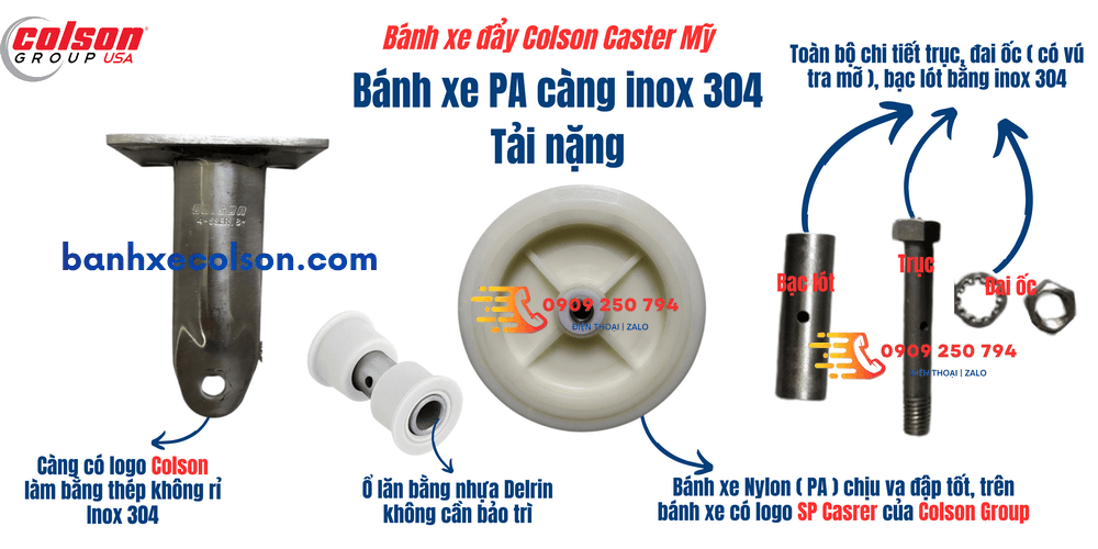 - Càng Inox 304 chống ăn mòn tuyệt đối: Càng bánh xe được chế tạo từ Inox 304 cao cấp. Nó có khả năng chống gỉ sét và ăn mòn xuất sắc trong mọi môi trường. Kể cả những nơi ẩm ướt, tiếp xúc hóa chất, hoặc yêu cầu vệ sinh nghiêm ngặt như y tế, thực phẩm, phòng thí nghiệm. Toàn bộ các chi tiết trục, đai ốc, bạc lót đều được làm từ inox 304. Xem thêm các loại bánh xe đẩy hàng càng inox Colson tại đây