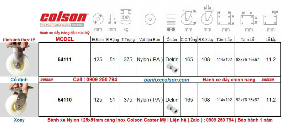 Thông số kỹ thuật chi tiết các loại bánh xe Nylon (PA) 125x51mm: