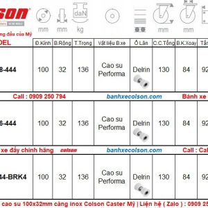 Để đáp ứng đa dạng các yêu cầu vận chuyển, hãng bánh xe đẩy Colson Caster Mỹ cung cấp dòng bánh xe đẩy với đường kính 100mm và bề rộng 32mm. Bánh xe được chế tạo từ vật liệu Cao su Performa độc quyền của Colson, kết hợp ổ lăn Delrin, và đặc biệt là càng inox 304 chống gỉ sét tuyệt đối, phù hợp với mọi môi trường khắc nghiệt.