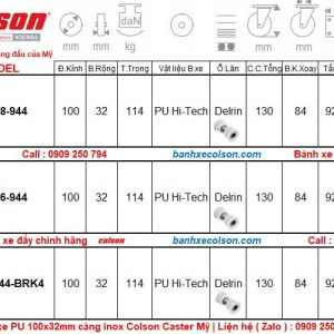 Dòng bánh xe đẩy Colson được cung cấp với đường kính 100mm và bề rộng 32mm. Bánh xe được chế tạo từ vật liệu Nhựa PU Hi-Tech, kết hợp với ổ lăn Delrin và đặc biệt là càng inox 304 cao cấp, đảm bảo khả năng chống ăn mòn và độ bền tối ưu trong mọi điều kiện.